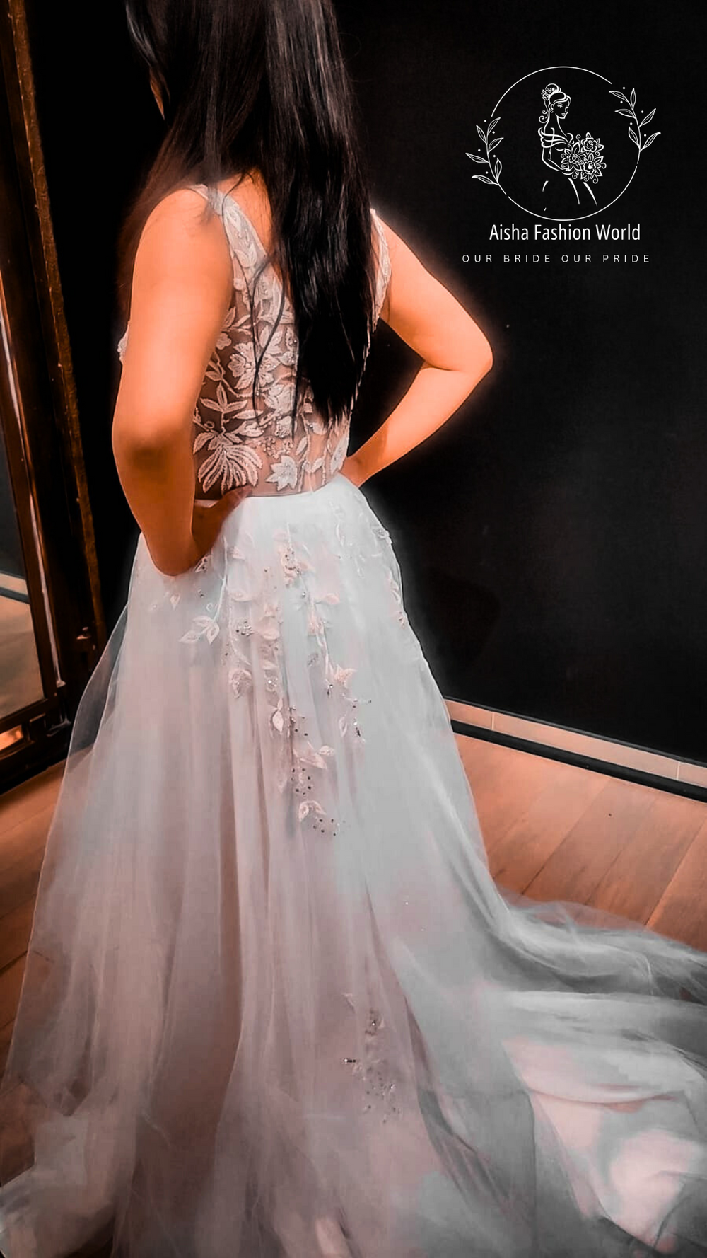 Embrace timeless elegance and ethereal beauty in this stunning A-line dress from Aisha Fashion World. This captivating gown features a dramatically long 90-inch train, ensuring you make a truly unforgettable entrance.